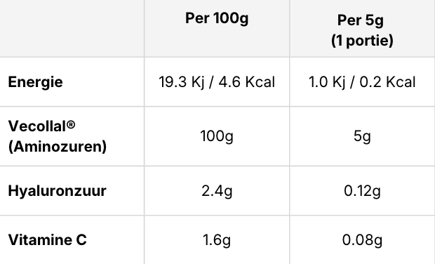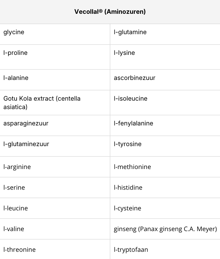 De zorgvuldig geselecteerde en gedoseerde ingrediënten (vitamine C, asiaticoside en ginsenosiden) stimuleren het menselijk lichaam om de exacte hoeveelheid aminozuren van VeCollal® te gebruiken om natuurlijk collageen te creëren.