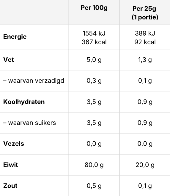 Een standaard portie van ongeveer 25 g levert circa 20 g eiwit, wat neerkomt op ongeveer 80 % eiwitgehalte. Dit maakt het een efficiënte manier om aan je dagelijkse eiwitbehoefte te komen.