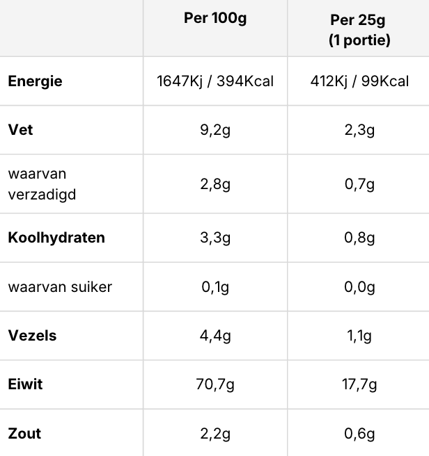 Een standaard portie van ongeveer 25 g levert circa 18 g eiwit, wat neerkomt op een eiwitgehalte van 71%. Dit maakt het een efficiënte manier om aan je dagelijkse eiwitbehoefte te komen.