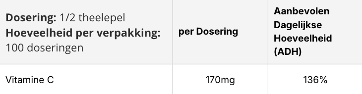 Ekopura Vitamine C bevat een dosering van 170mg wat gelijk staat aan 136% van de aanbevolen dagelijkse hoeveelheid. Ekopura Vitamine C wordt zeer goed door het lichaam opgenomen omdat het een 100% puur en onbewerkt fruitpoeder betreft.